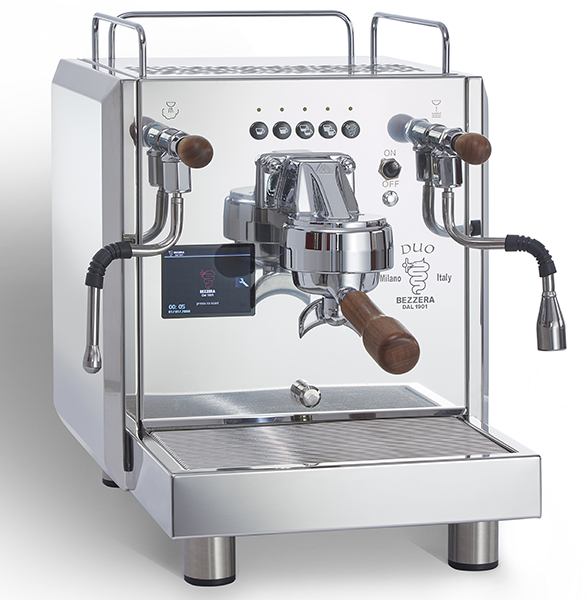 Das neue DUO-Modell ist eine hochentwickelte kompakte Espresso-Kaffeemaschine, die die Funktionen einer professionellen Espresso-Kaffeemaschine beinhaltet und in der DE-Version mit Bezzerea Brühruppe und 3 PID-Thermostaten und in der manuellen MN-Version mit der traditionellen E61-Technologie erhältlich ist; die anspruchsvollere Software und Elektronik verfügt über ein 3,5" -Touch-Display, welches die Steuerung des Doppelkesselsystems ermöglicht.